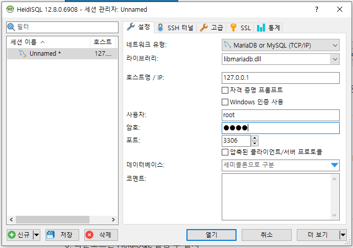 5. 다운로드한 HeidiSQL 설치 후 실행. 아래의 신규를 클릭하고 암호는 아까 MySQL시 설정한 비밀번호 입력