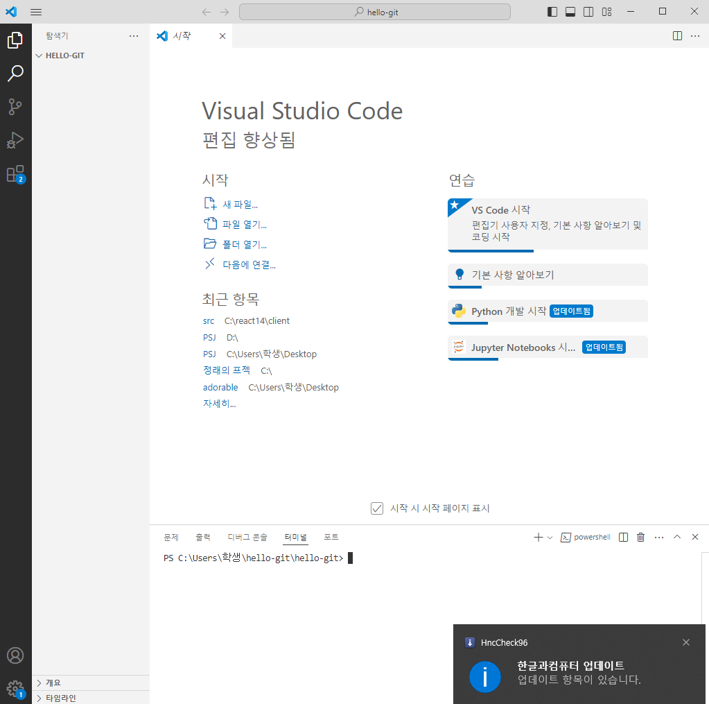 1. [작업 폴더 추가] hello-git 폴더를 VS Code 위로 드래그