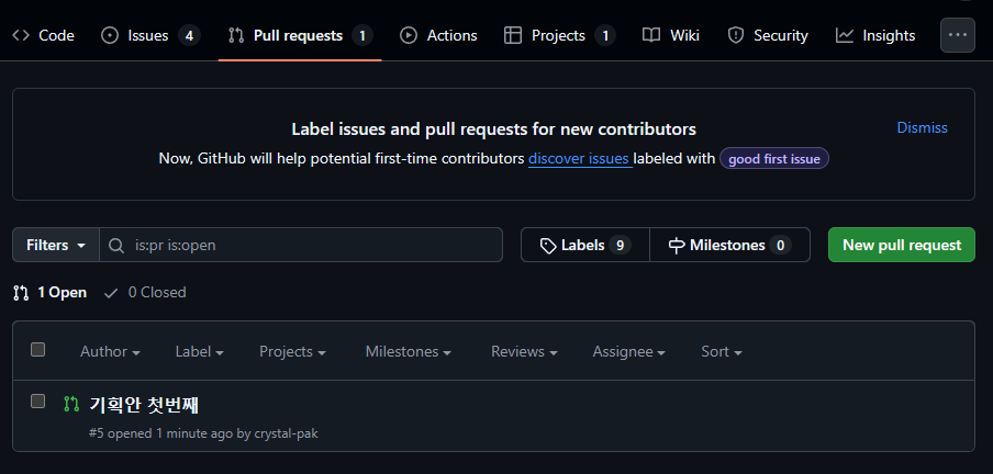 깃허브 저장소에서 [Pull requests]를 클릭하고 Open 상태인 PR을 선택한다.