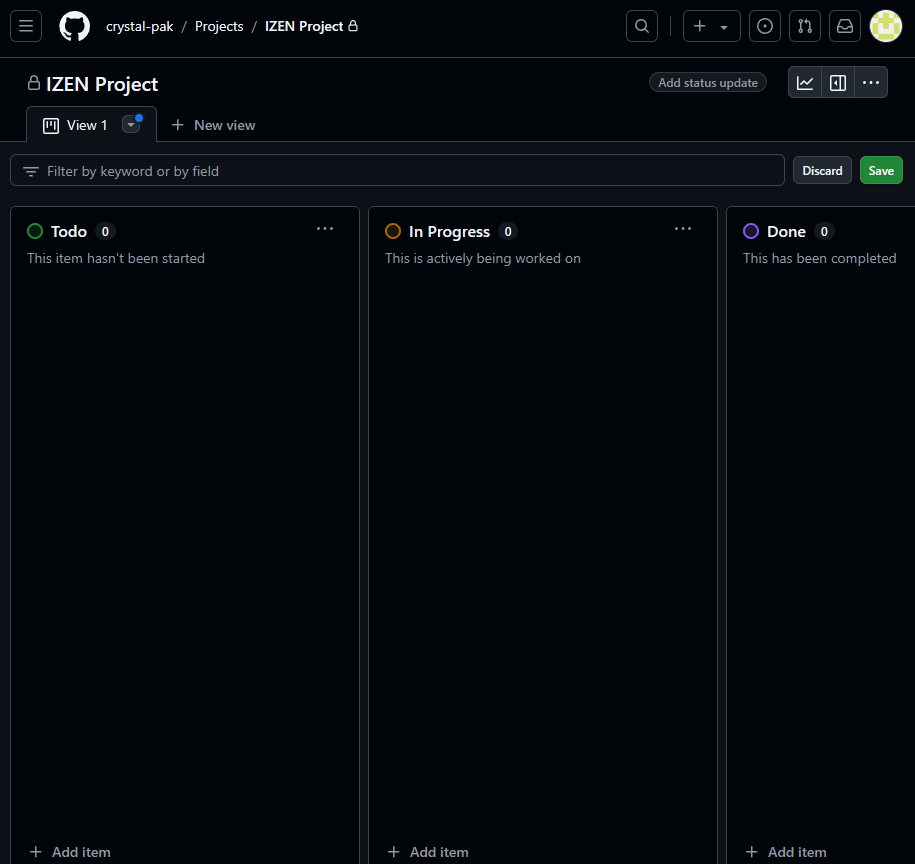 View를 Board로 변경해 주고 Todo 열에 있는 [Add item]을 클릭한다.