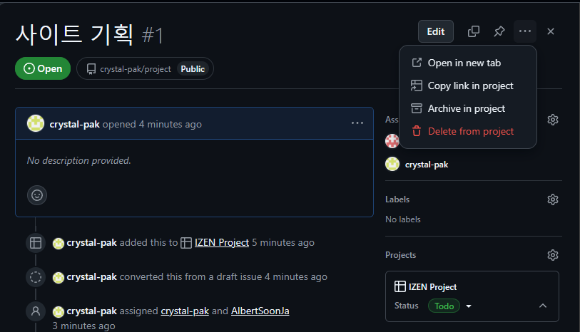 할 일 항목에서 [...] 클릭 후 [Open in new tab]을 선택한다. 이슈 화면의 'Assigness' 항목에서 담당자를 선택한다.