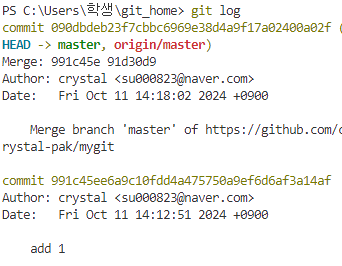 나의 로그는 일반적인 상황에서 뜨는 로그는 아니다. 로컬 브랜치가 원격 브랜치보다 뒤처져 있는 경우(git pull을 하지 않은 상태에서 푸시하려고 할 때) Git은 로컬에서 원격 변경 사항을 통합하기 위해 병합을 요구할 수도 있다. 이때 병합 커밋이 생성되면서 위와 같은 메시지가 발생한다.