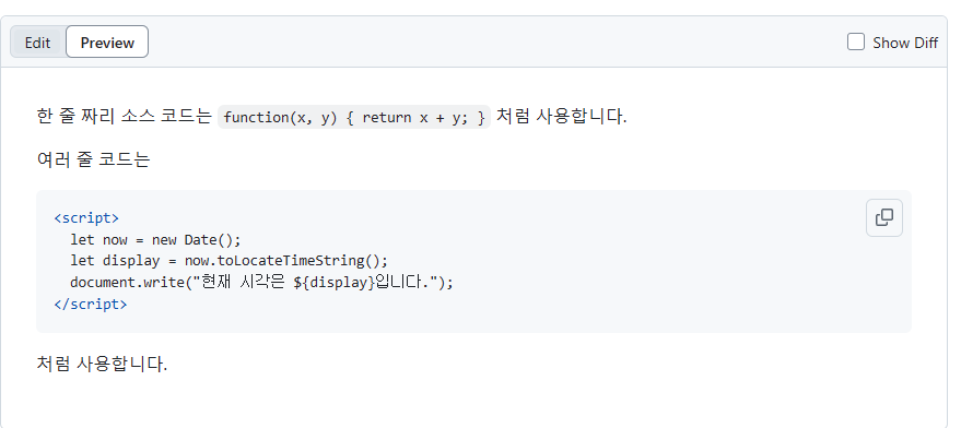 한 줄 코드는 코드 앞에 `(백틱) 추가, 여러 줄 코드는 코드 앞뒤에 ```를 추가한다.