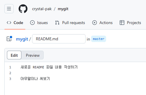 README 파일 수정화면에 들어와서 이미지를 넣을 위치에 마크다운 코드를 입력해 준다.