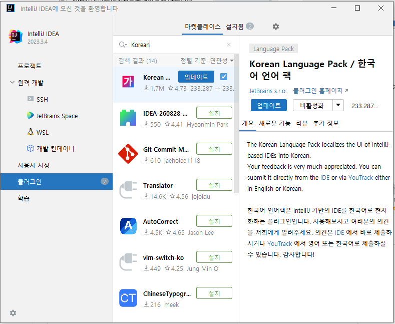 인텔리제이 플러그인에서 다음 패키지를 설치하면 한국어를 사용할 수 있다.