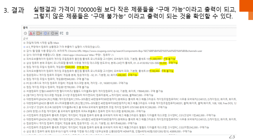 컴퓨터 상품명과 가격을 추출하고, 지정한 가격 조건에 따라