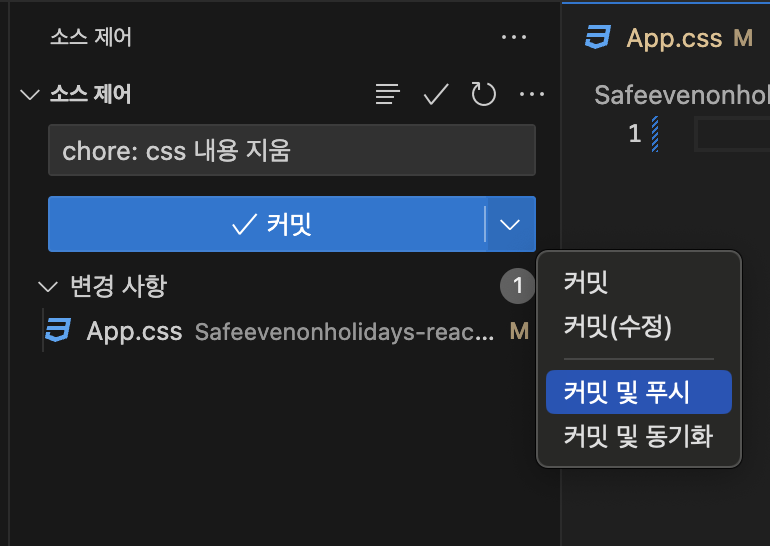 커밋 메시지를 입력하고 [커밋 및 푸시]를 클릭합니다.